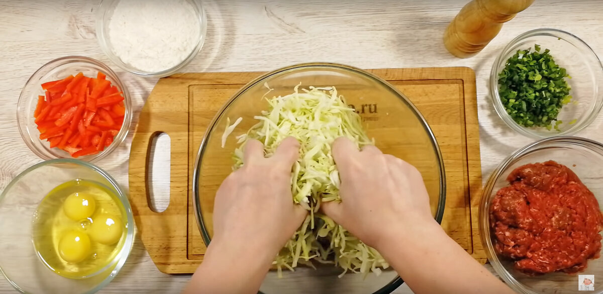 Для связки ингредиентов разбиваются три яйца и выливаются в миску с фаршем и капустой. Также всыпается 80 граммов муки и чайная ложка разрыхлителя теста. Вся масса хорошо перемешивается до однородного состояния.