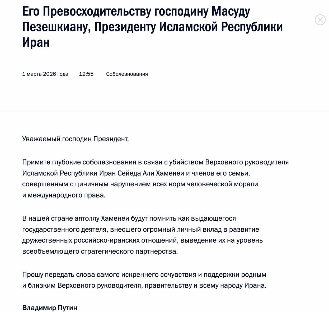 Владимир Путин выразил соболезнования президенту Ирана в связи со смертью аятоллы Хаменеи
