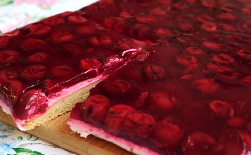 Теперь пирог собирают: на остывший корж выкладывают слой крема, а затем заливают вишневую начинку. Готовое блюдо отправляют в холодильник до полного застывания желатина.
