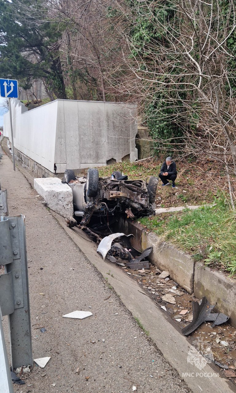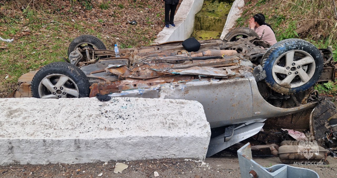Жёсткое ДТП произошло в Сочи. Mazda съехала с трассы, перевернулась и упала в ливневую канализацию.
