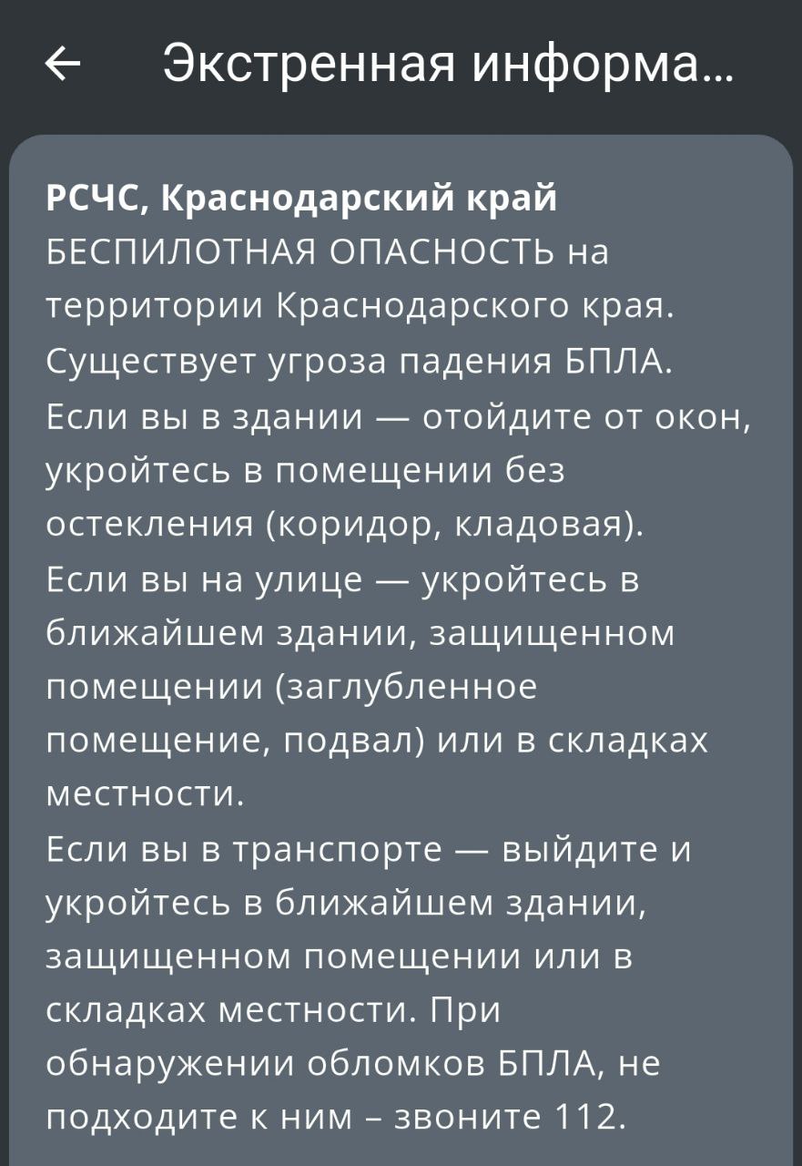 Не паникуем, идёт проверка системы оповещения жителей.Люди пишут, что на окраинах Краснодара сигнал не слышно. Как у вас?Телегу замедляют, подписывайся на нас в MAX