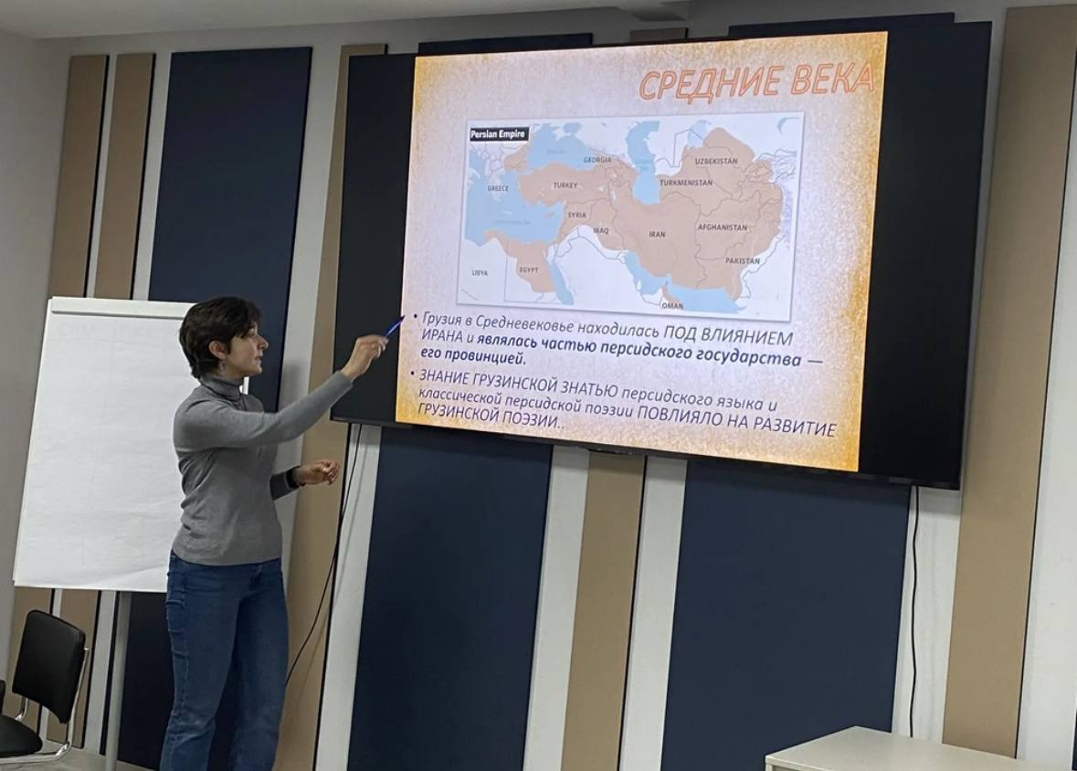 Давний друг Центра национальных объединений и талантливый рассказчик Аница Делич, заведующая отдела массовой работы Центральной городской библиотеки им. Э.Э. Баллиона, пригласила ребят в увлекательное путешествие по истории грузинской литературы, к её истокам и традициям. Слушатели перенеслись на сотни лет назад в V век – время появления грузинского письма и грузинской поэзии. Они узнали, что самые ранние поэтические произведения были преимущественно религиозными, отражая обращение страны в христианство. Вместе с тем, на рубеже 12-13 вв. величайший грузинский поэт Шота Руставели написал бессмертную поэму «Витязь в тигровой шкуре». Поэма была переведена на множество языков, включая русский, английский, французский, немецкий и другие.