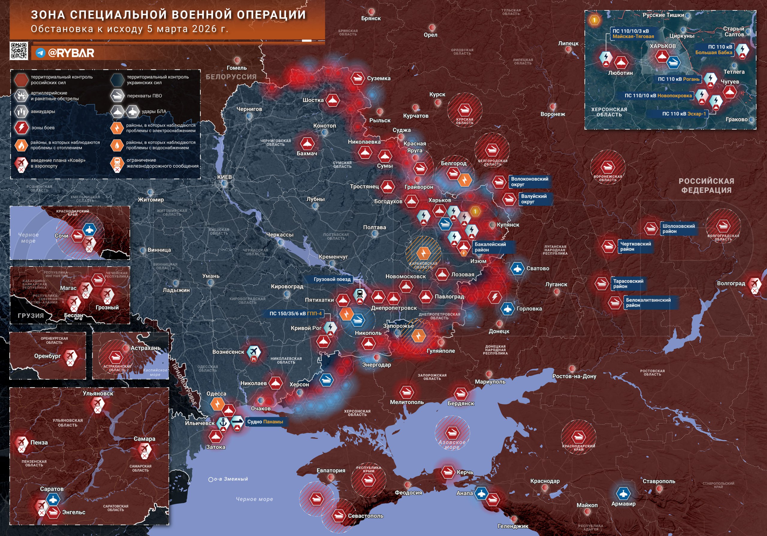 Российские войска за сутки поразили шесть подстанций противника, большинство из них в окрестностях Харькова. В Днепропетровской области под удар попал очередной железнодорожный состав. А в порту Ильичевска Одесской области атаковано судно под флагом Панамы.
