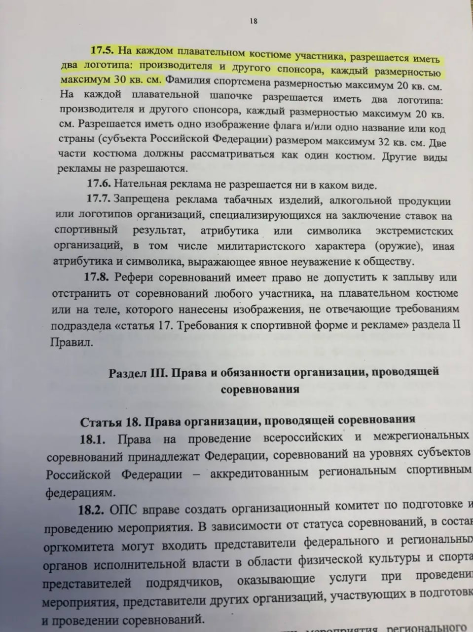 В пресс-службе Минспорта Краснодарского края пояснили изданию «Подъём», что пункт 17.5. Статьи 17 Раздела II Правил вида спорта «Плавание» действительно подразумевает ограничения по размещению логотипов и их размеров на форме участников.