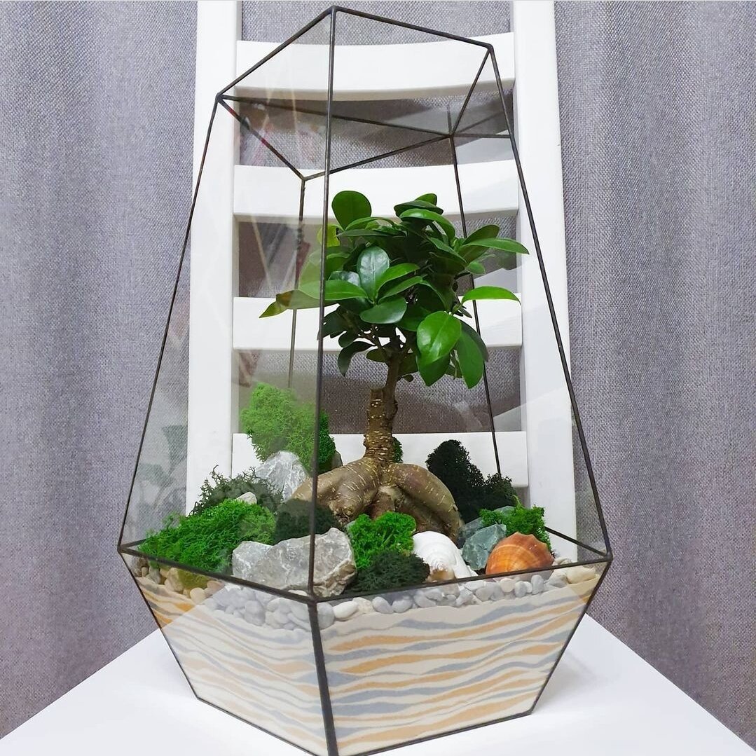 Фикус микрокарпа в стильном флорариуме - это не только красивое украшение, но и практичный подарок для занятых мужчин. Его компактный размер и небольшой уход делают его идеальным вариантом для рабочего стола или дома. Такой флорариум способен освежить обстановку и дополнить интерьер, вызывая восторг у получателя.