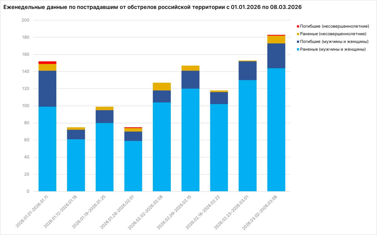 За неделю со 2 по 8 марта от обстрелов украинских нацистов пострадали 183 мирных жителя: ранены 153 человека, в том числе 9 несовершеннолетних, погибли 30 человек, в том числе 1 ребенок. Всего по гражданским объектам на российской территории за прошедшие семь дней украинские вооруженные формирования выпустили не менее 3 563 боеприпасов.