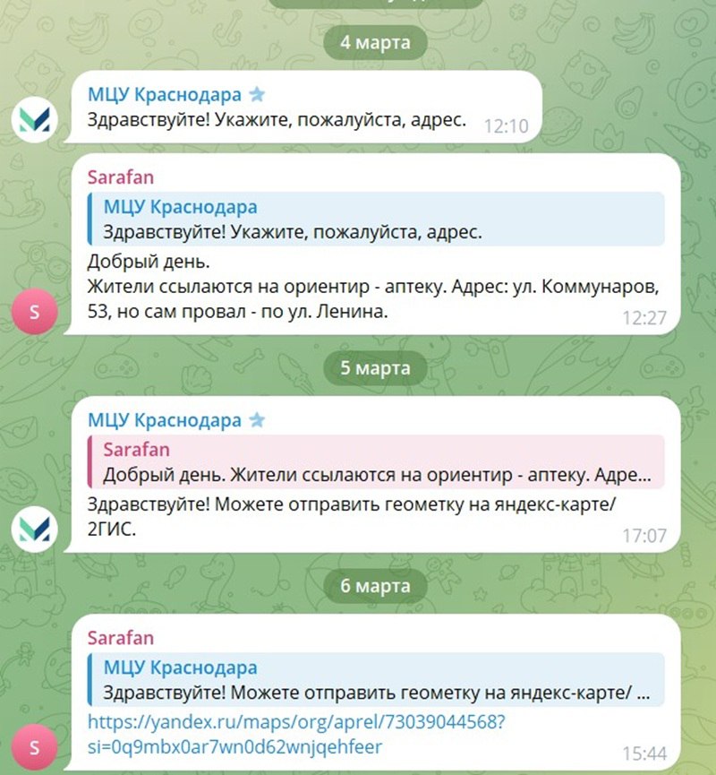 Ранее, 4 марта, на наш пост отреагировал Муниципальный центр управления с просьбой указать адрес. Днем позже попросили прислать геометку на карте. Все выполнили – больше обратной связи не получали.