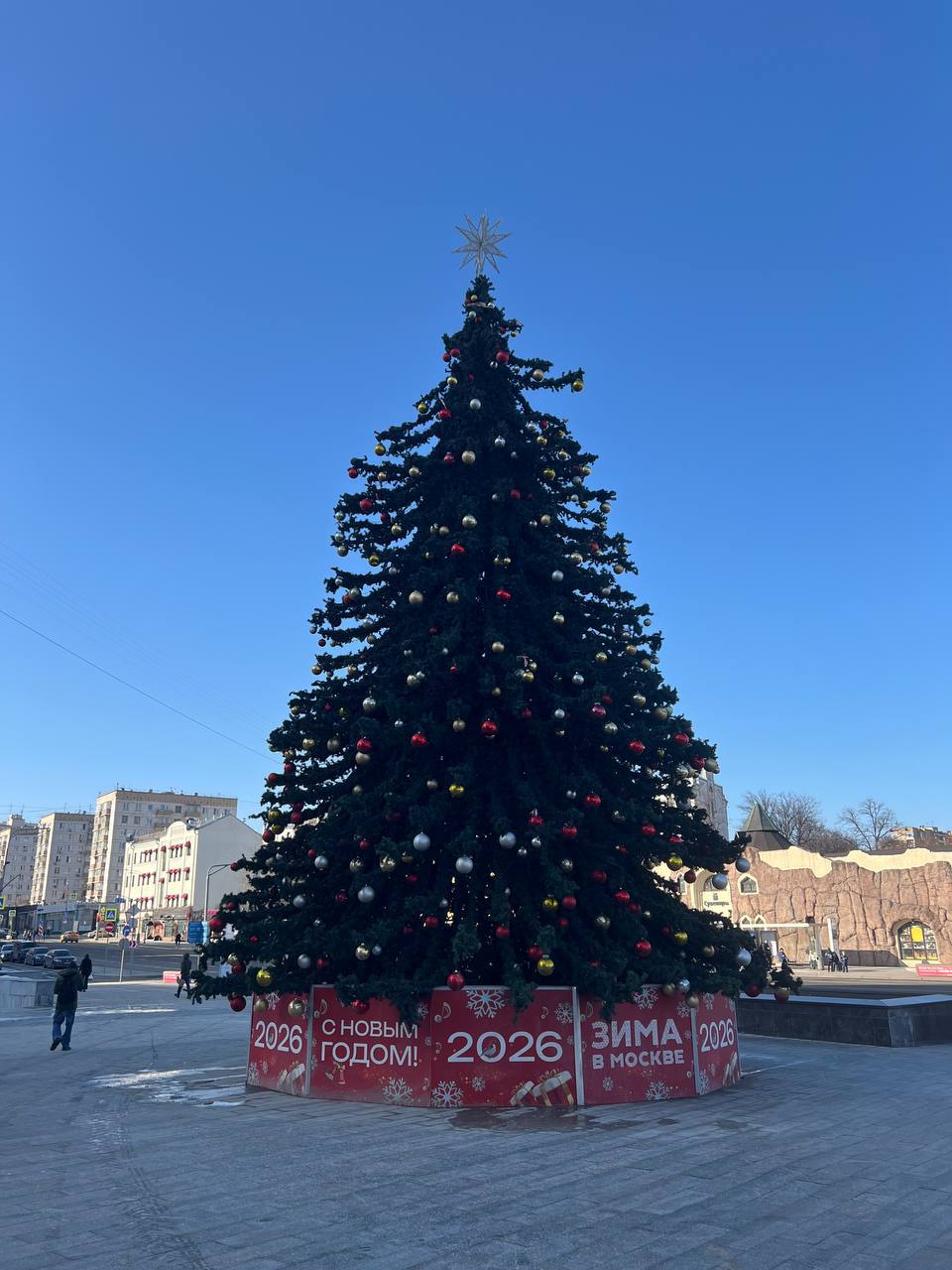 Новогодняя ёлка, установленная в Москве 1 ноября 2025 года, всё ещё стоит — на дворе уже 10 марта, вовсю весна, а она не спешит исчезать.