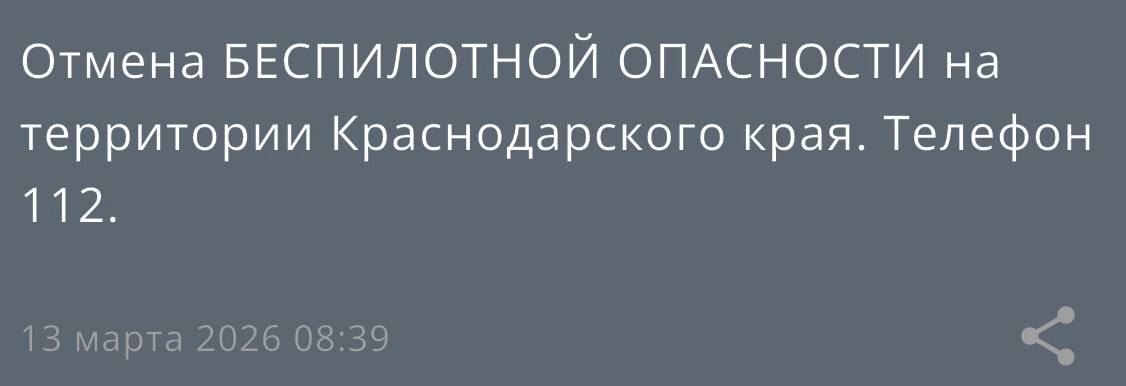 Отмена сигнала «Беспилотная опасность» на территории Краснодарского края.