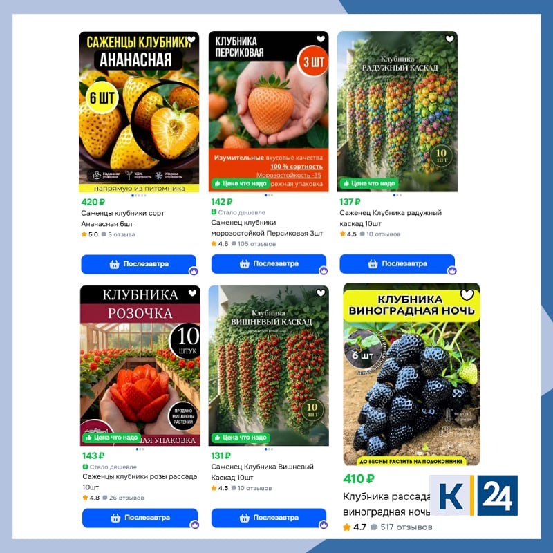 Однако фотографий покупателей с подтверждением такого невероятного урожая мы не нашли — только отзыв о том, что вместо черной и фиолетовой клубники выросла... обычная красная ягода.