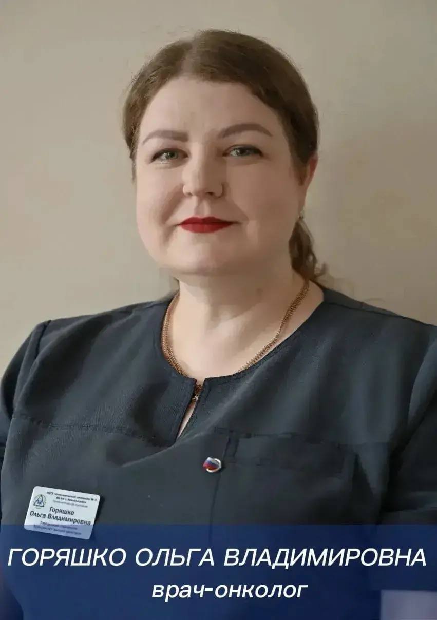 Ольга Владимировна Горяшко – врач-онколог высшей категории, автор ряда научных публикаций, председатель врачебной комиссии диспансера. Вот уже 16 лет она занимает должность заведующей поликлиническим отделением. Под ее руководством коллектив врачей неизменно совершенствует свои навыки, обеспечивая высокий уровень медицинской помощи населению края. Опыт, знания и любовь к выбранному делу Ольги Владимировны служат примером для коллег и молодых врачей.