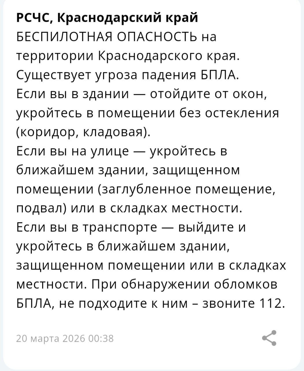 Внимание! Опасность БПЛА.Сохраняйте спокойствие. Пожалуйста, позаботьтесь о собственной безопасности и безопасности близких.Телефон экстренных служб — 112.