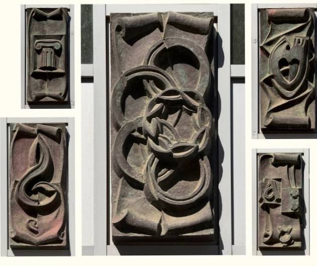 Он создал чугунные барельефы на Доме книги, символизирующие науку, искусство и спорт.