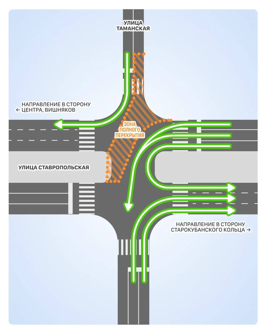На Таманской в районе перекрёстка будут разрешены только повороты направо (на Ставропольскую). Движение прямо и налево — под запретом.