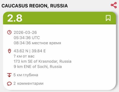 Землетрясение магнитудой 2,8 произошло в районе Сочи.