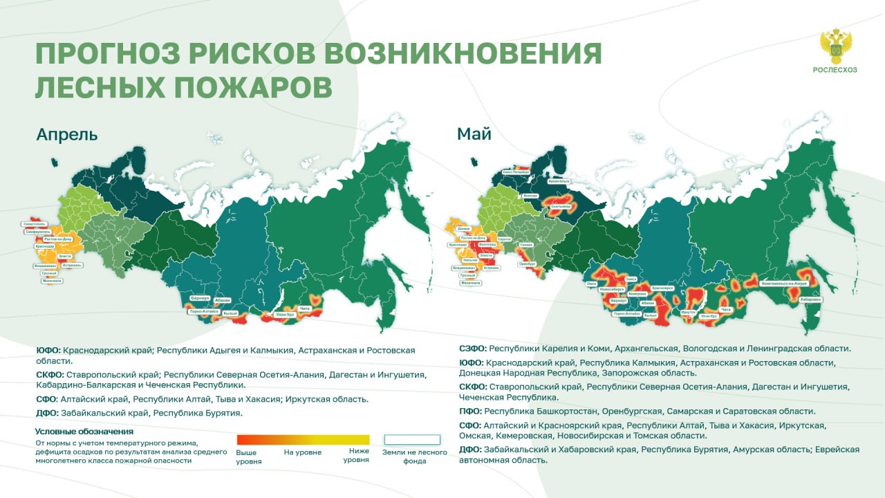 «Мы видим, что зима и начало весны позволяют ожидать старт лесопожарного сезона в апреле – а не в марте, как в прошлом году. Однако это не повод расслабляться. Уже сейчас регионы должны быть полностью готовы к сезону. Особенно регионы Юга России и Кавказа – здесь силы и средства должны быть приведены в максимальную готовность. Напомню, что по статистике, практически все лесные пожары весной возникают по вине человека. Несоблюдение правил пожарной безопасности в лесах – например, недостаточно потушенный костер, оставленный в лесу мусор, искрящее неисправное оборудование – может привести к серьезным последствиям. Отдельно скажу о выжигании сухой растительности – нужно помнить, что делать это категорически запрещено и незаконно», - подчеркнул руководитель Рослесхоза Иван Советников.