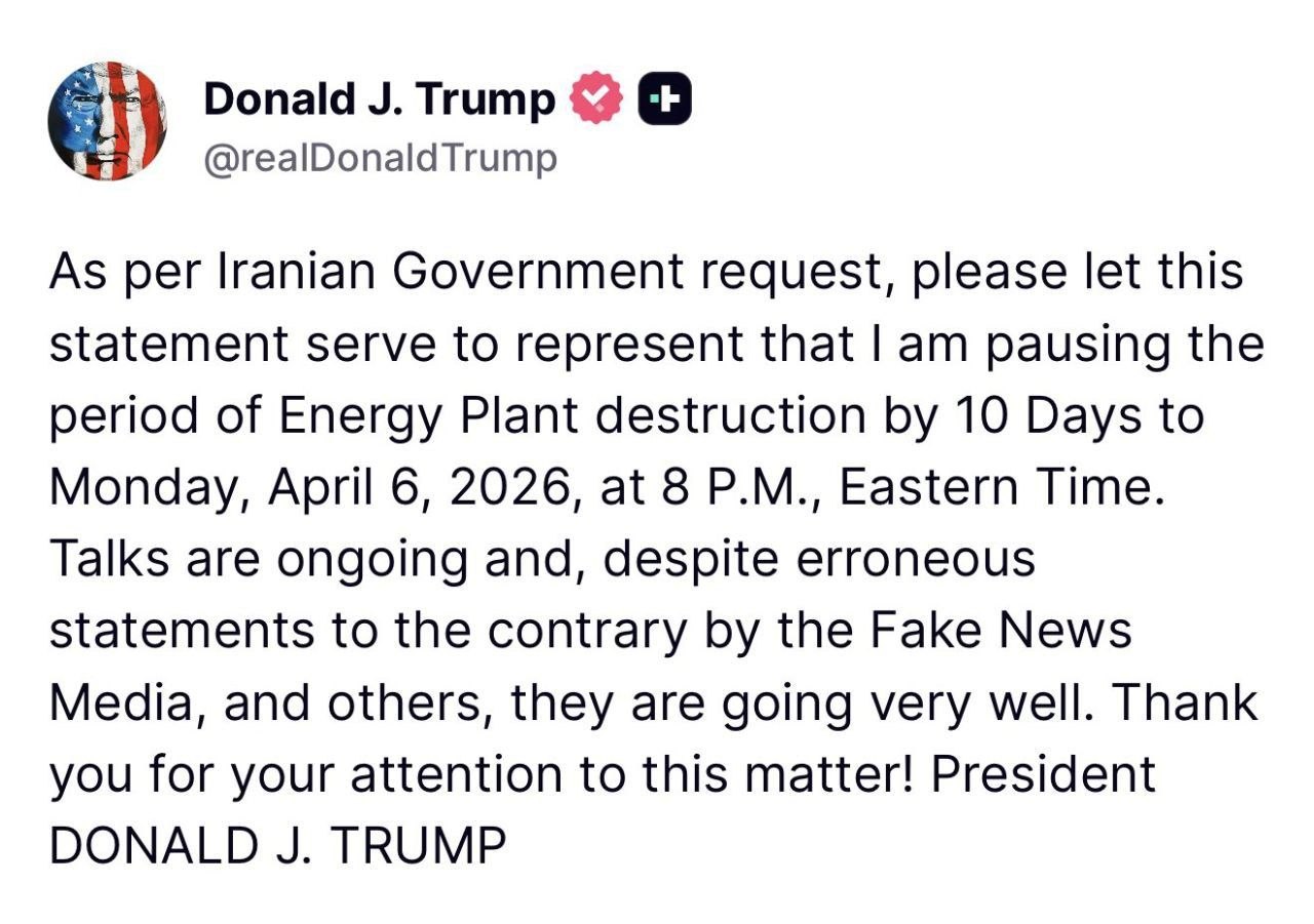 В публикации на платформе TruthSocial президент США сообщил, что приостанавливает запланированные действия — якобы «по просьбе иранского правительства». Также он подчеркнул, что переговоры между сторонами продолжаются и проходят успешно, «несмотря на заявления фейковых СМИ и других источников».