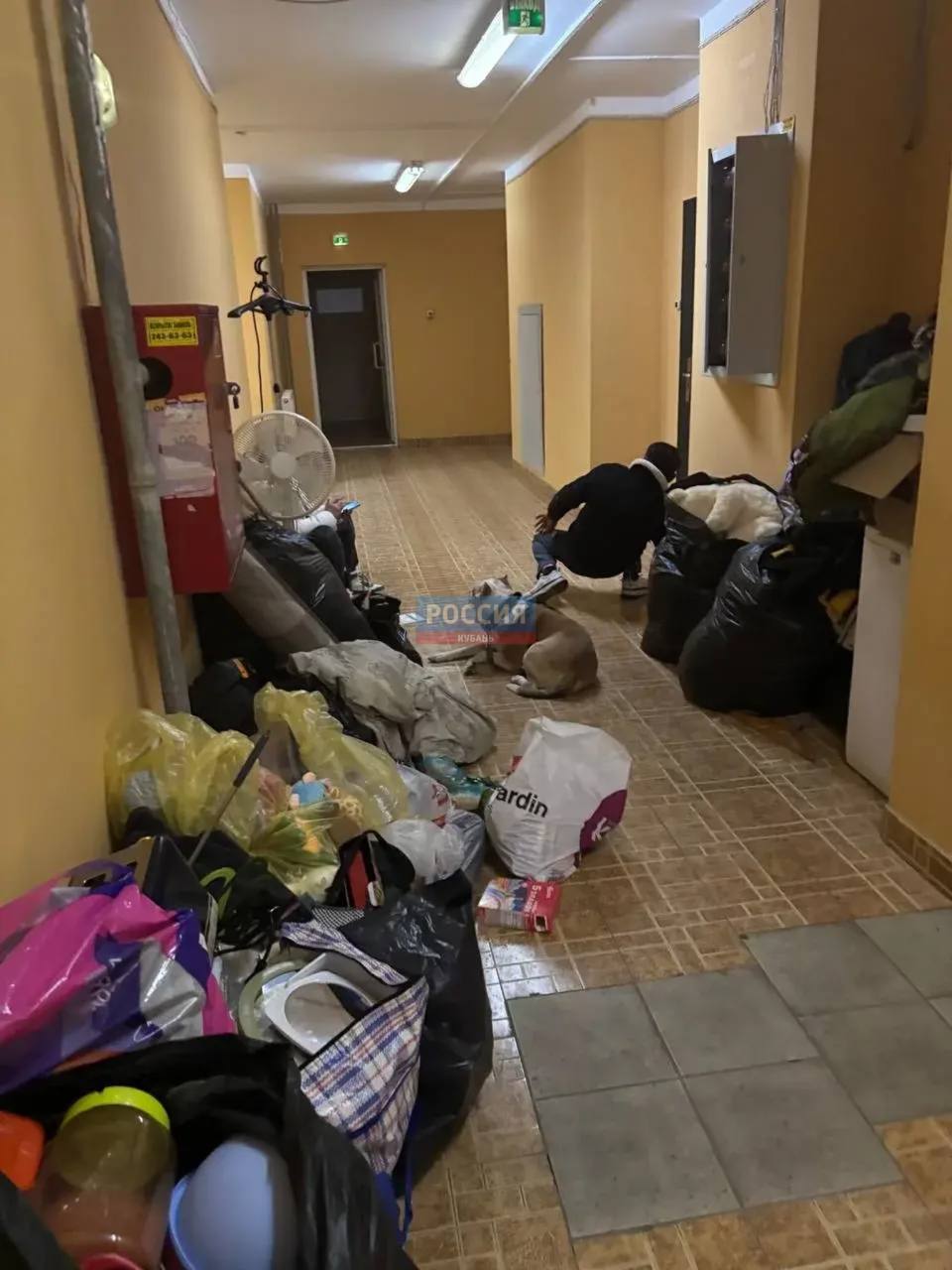 Один из этажей оказался завален вещами, которые были выставлены из съемной квартиры. Однако бывшие жильцы не стали уходить далеко — они обосновались прямо в тамбуре вместе с собакой