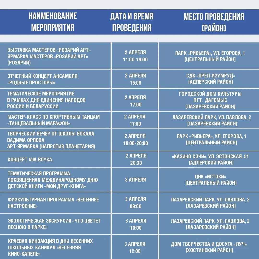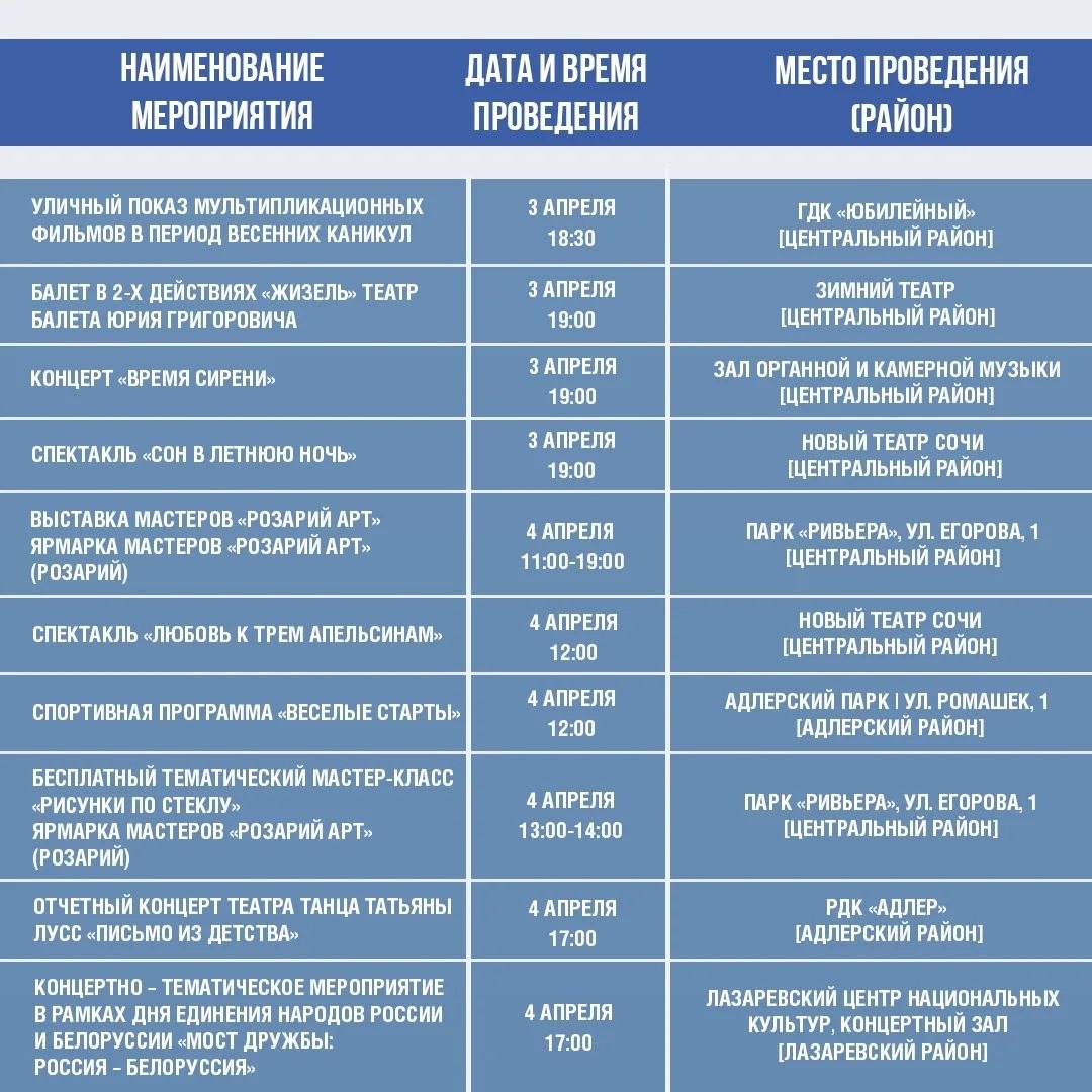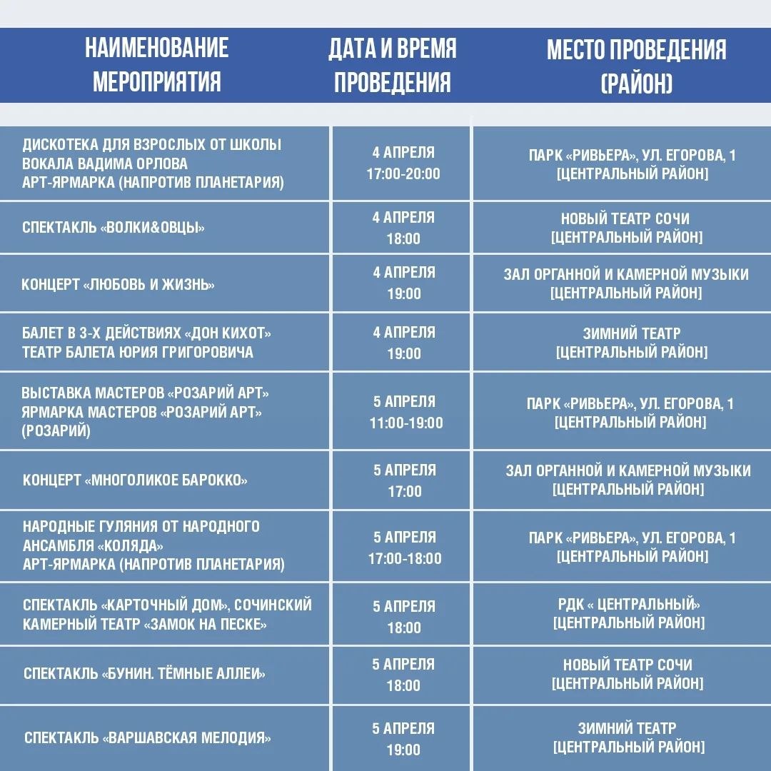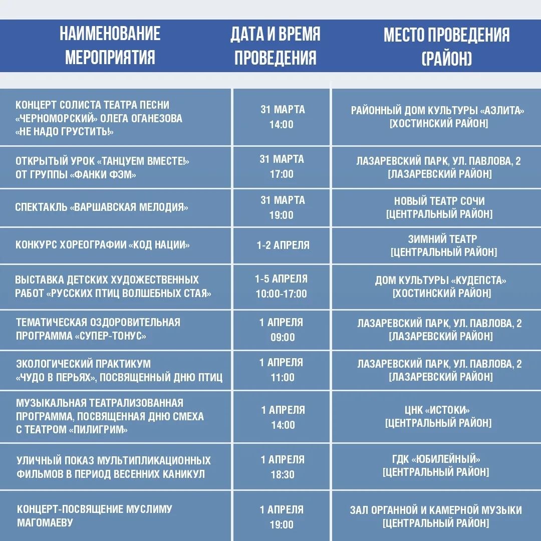 Афиша культурных и досуговых мероприятий в Сочи с 31 марта по 5 апреля.