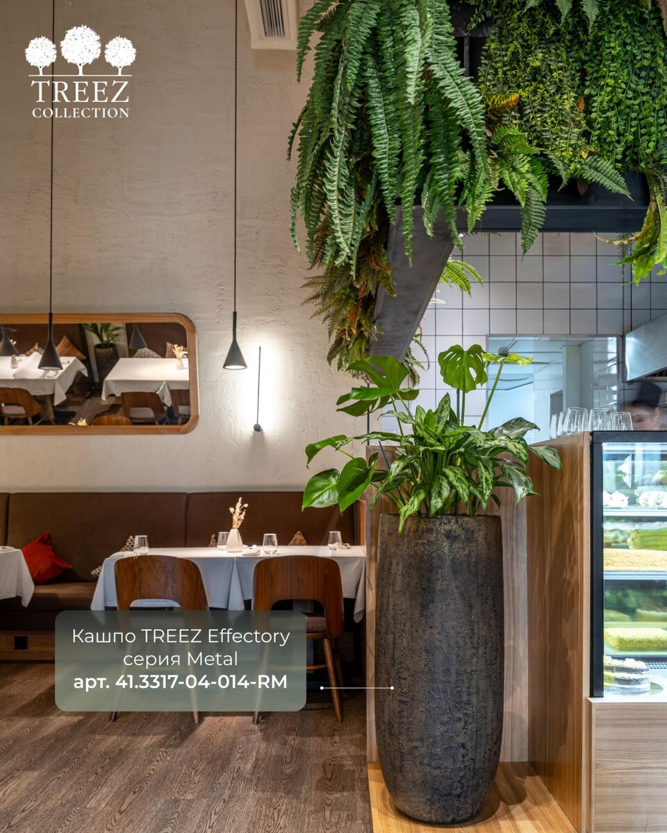 - Фитостена TREEZ в барной зоне, создающая эффект зелёного оазиса и оживляющая индустриальный интерьер.
