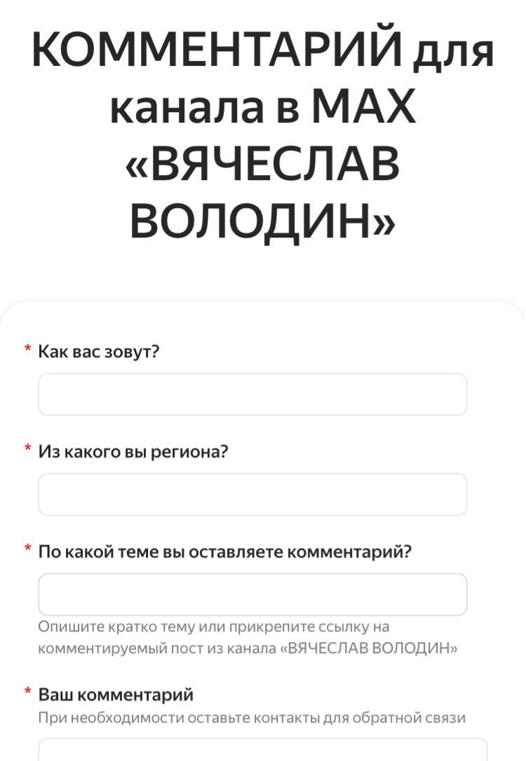 Чтобы оставить комментарий в мессенджере Max Спикера Госдумы Володина, нужно заполнить специальную форму с указанием ФИО и личного адреса.