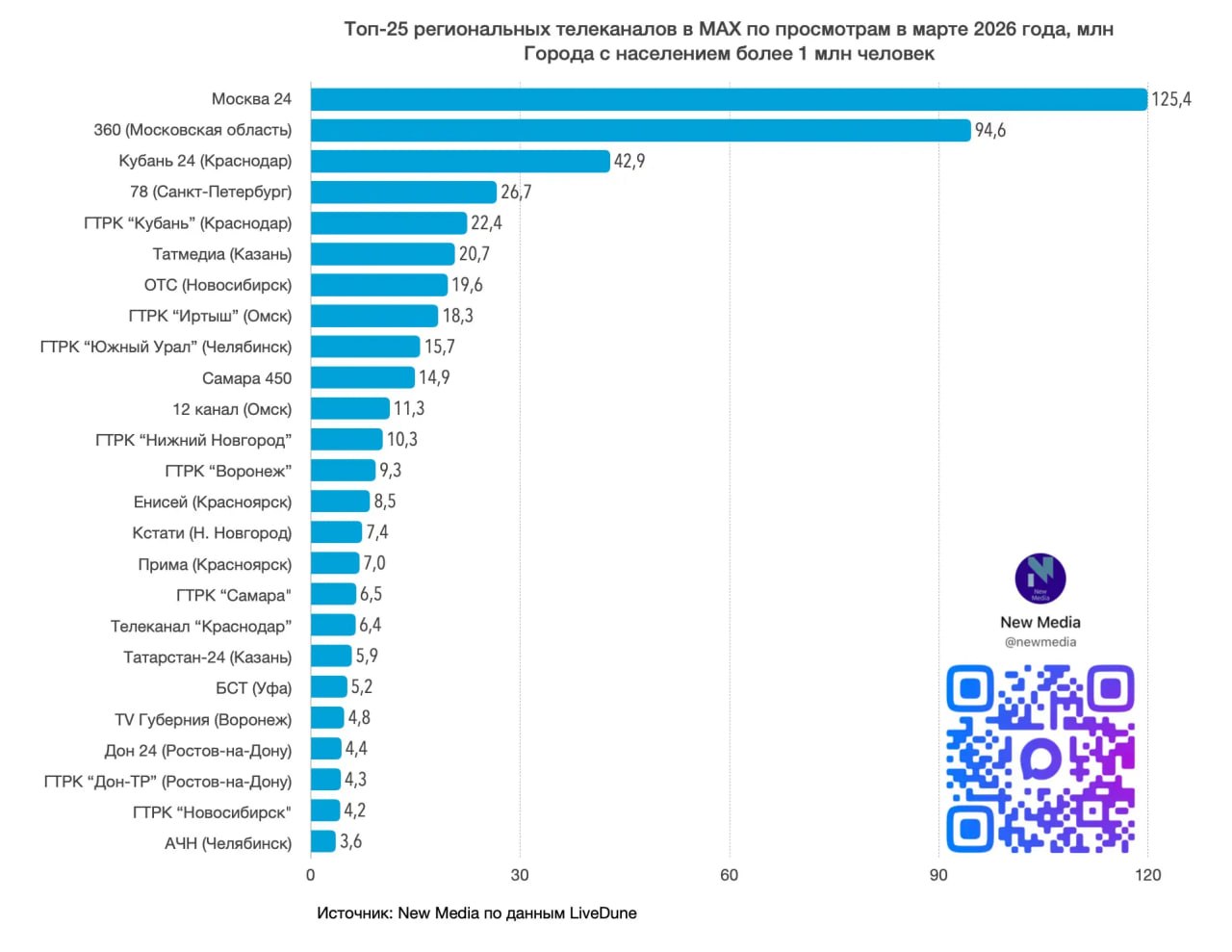 В марте 2026 года число просмотров наших постов в MAX достигло 6,4 млн. По этому показателю медиахолдинг «Краснодар» занял 18 место среди телеканалов во всех городах России с населением более 1 млн человек.