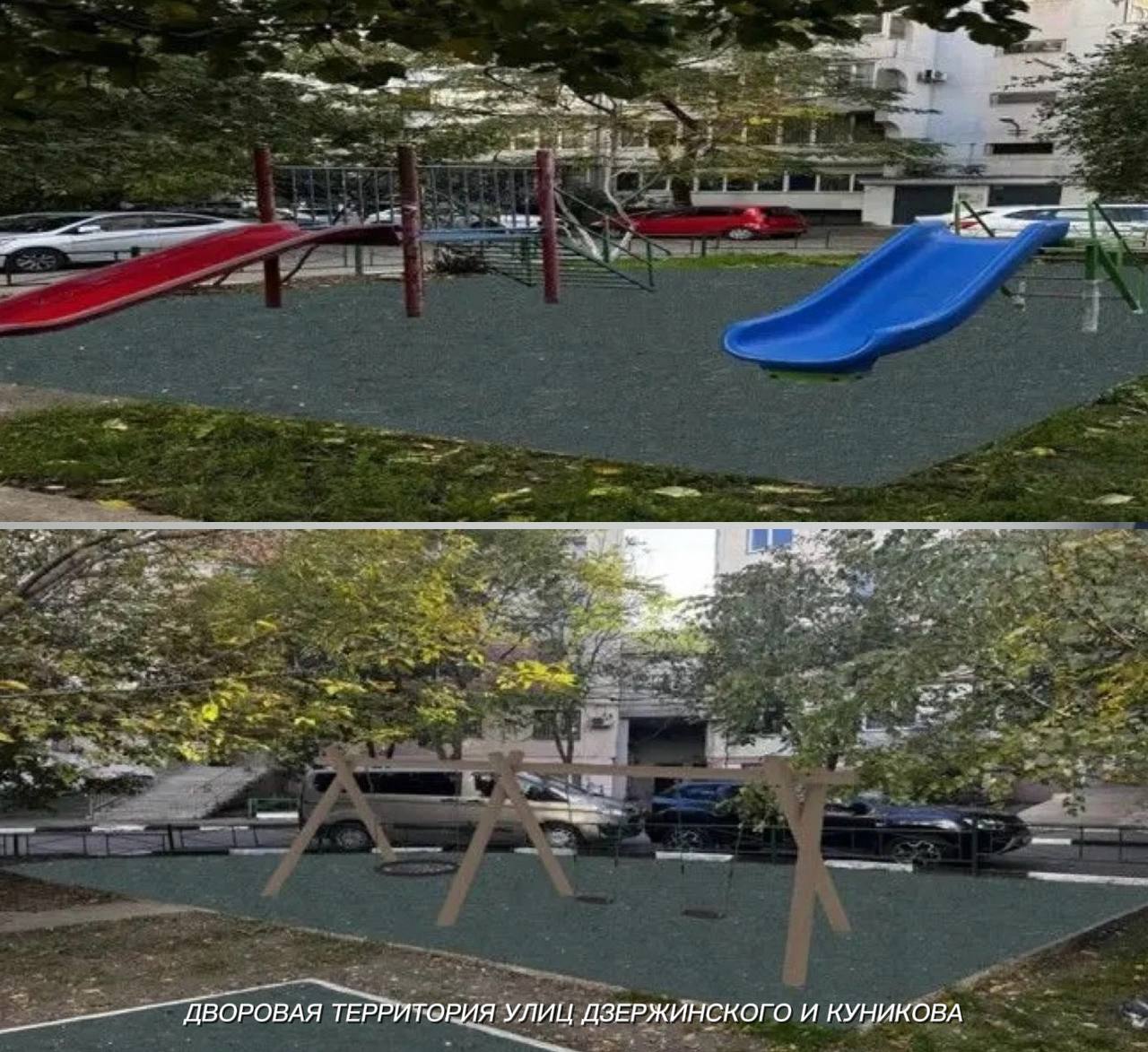 Во дворах домов по улицам Дзержинского и Куникова будет реализовано комплексное благоустройство с созданием современных игровых и спортивных площадок для детей и подростков. Территория разделена на семь зон, и по инициативе жителей на трех из них уложат безопасное покрытие и установят качели для детей разных возрастов.