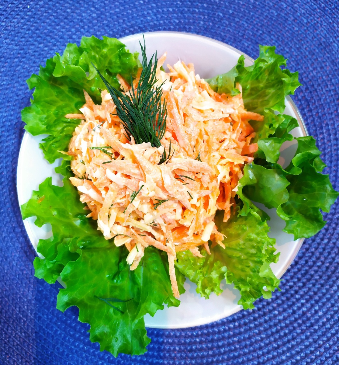 Для начала укроп измельчается. Затем морковь и сыр натираются на терке и смешиваются в глубокой миске. После этого добавляются порубленный укроп, а также соль и перец по вкусу. Все составляющие тщательно перемешивают и заправляют сметаной.