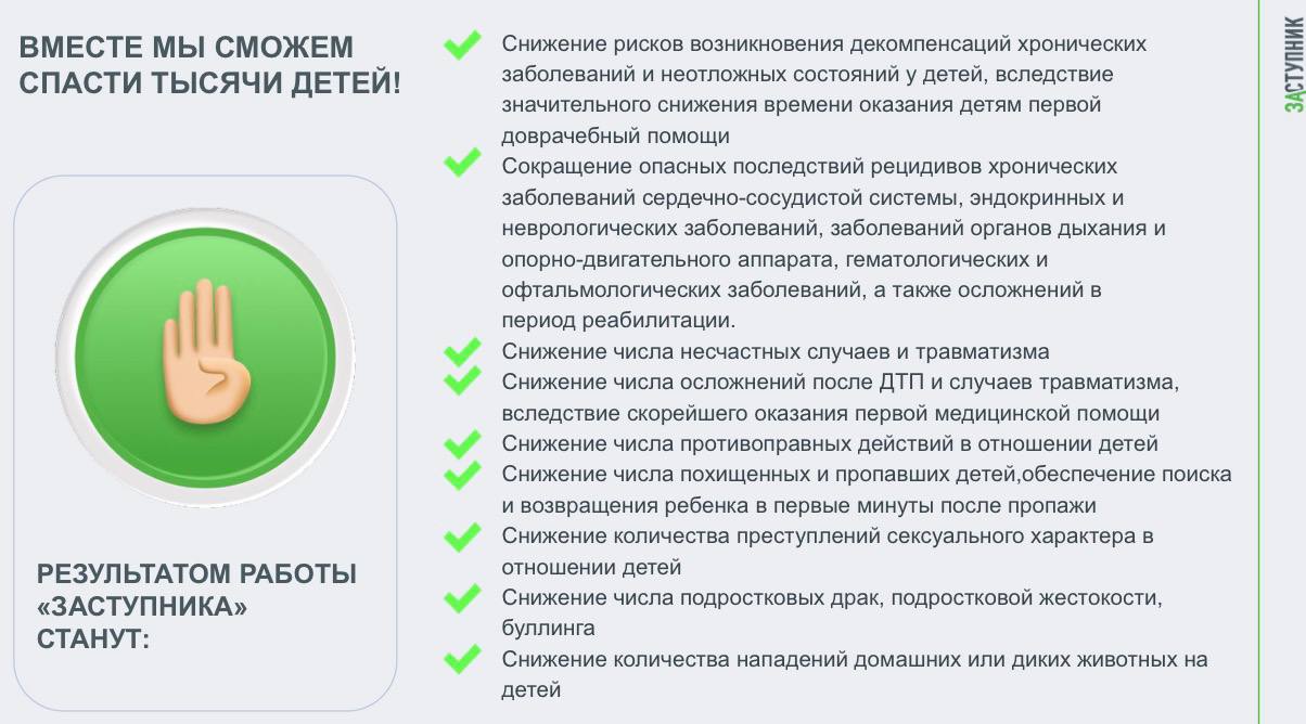 Проект направлен на повышение уровня безопасности детей в Краснодарском крае, посредством включения родительского сообщества в систему взаимопомощи с использованием телефона. Основным инструментом проекта является мобильное приложение «Заступник», с помощью которого дети могут быстро отправить сигнал тревоги, а находящиеся поблизости пользователи — оперативно прийти на помощь.