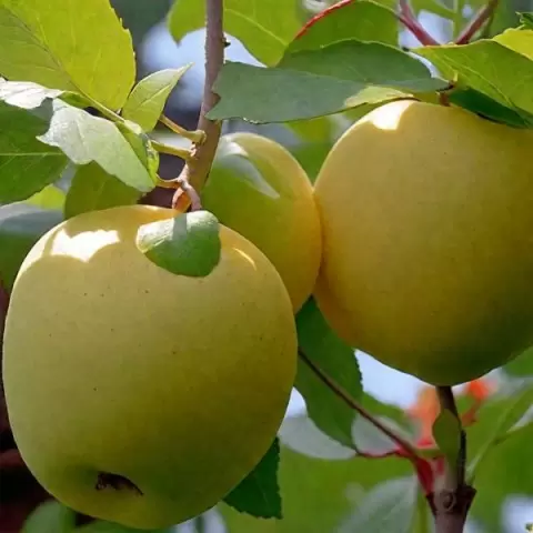 Яблоки имеют усеченную конусообразную форму, их окраска варьируется от солнечного желтого до легкого румянца на светлой стороне, что делает их визуально привлекательными. Мякоть при съеме плотная и крупнозернистая, но её вкус будет раскрыт только через 2-3 недели хранения.