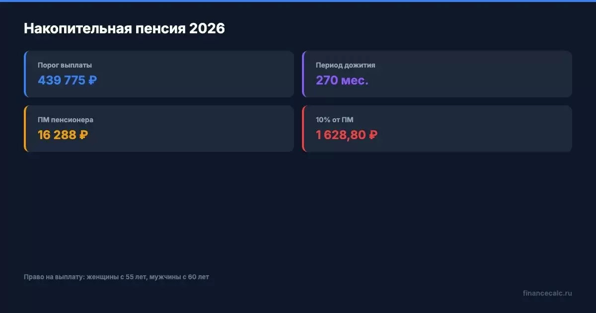 - Единовременная выплата: вся сумма сразу, если расчетная ежемесячная накопительная пенсия составляет меньше 10% от прожиточного минимума пенсионера (в 2026 году — 1 628,80 рублей).