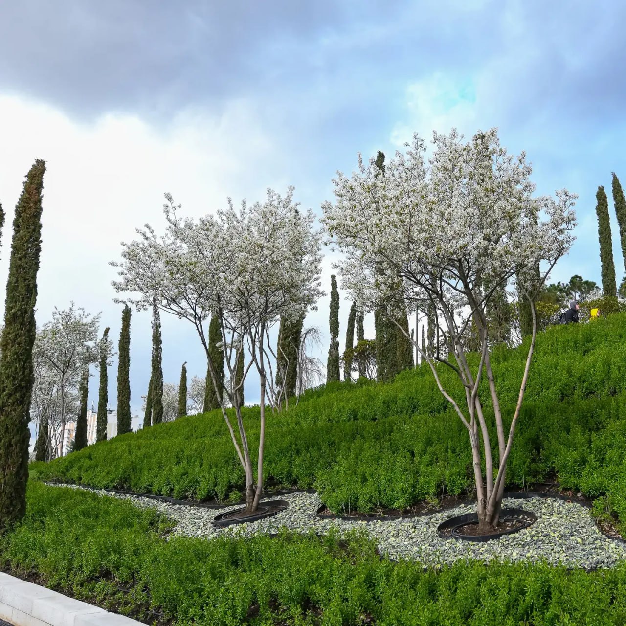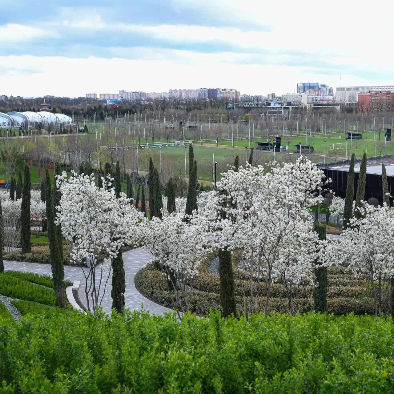Самое нежное оформление на холме в новой локации в парке «Краснодар». Сейчас на аллеях цветут деревья ирги. Подобраться к кружевам можно с северной парковки на улице Героя Сарабеева.