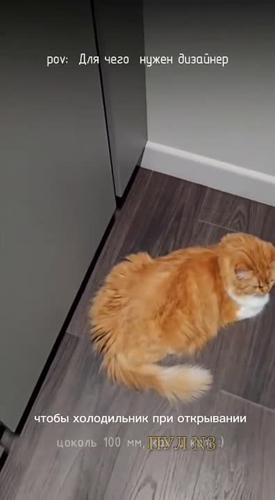 «Вот для чего нужен дизайнер – для того, чтобы всё точно рассчитать. Наш дизайнер снял размеры нашего кота и под кота сделал высоту цоколя, чтобы холодильник при открывании идеально проходил, под размер самого кота. Вот, просто идеальное расстояние. Всё чётко»: