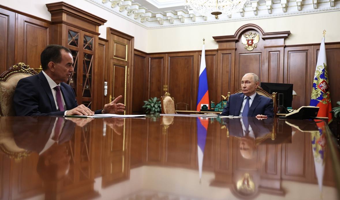 Президент России провел рабочую встречу с губернатором Краснодарского края поздно вечером 10 апреля в Кремле.