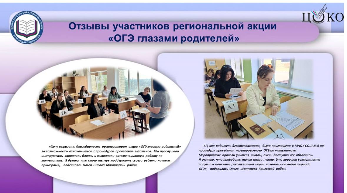 «Проведение акции «ОГЭ глазами родителей» считаю полезным мероприятием. Мы получили ответы на многие вопросы, связанные с ОГЭ, разобрались в порядке проведения экзаменов. Теперь нам будет проще настроить ребенка на положительные эмоции. Желаю всем девятиклассникам удачи на экзаменах!» – поделилась Ирина, одна из участниц акции.
