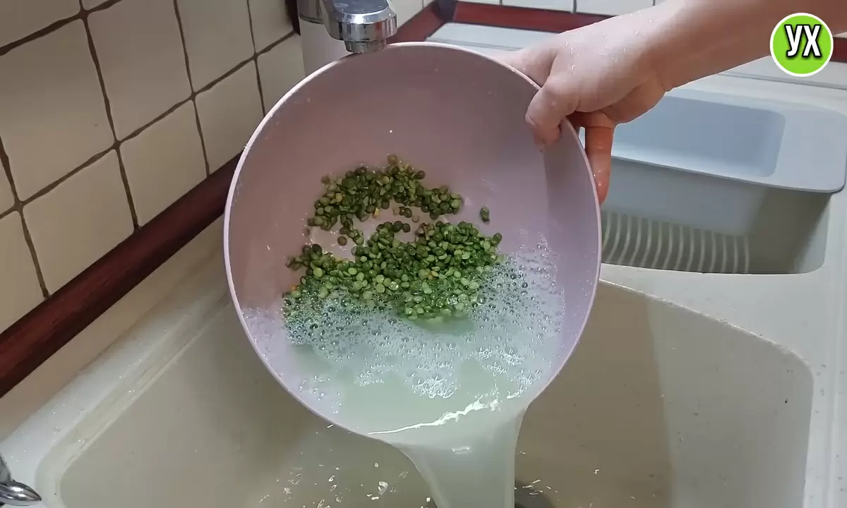 Вечером горох необходимо тщательно промыть и оставить в холодной воде на ночь, чтобы он хорошо набух. Утром его вновь промывают, перекладывают в кастрюлю и заливают горячей водой — так, чтобы она покрывала горох примерно на два пальца. Затем добавляют соль и ставят на огонь.