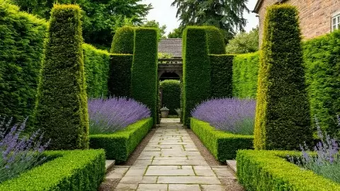 - Самшит: Идеален для создания структурных границ и живых изгородей, его мелкие листья подчеркивают аккуратность и ухоженность сада.