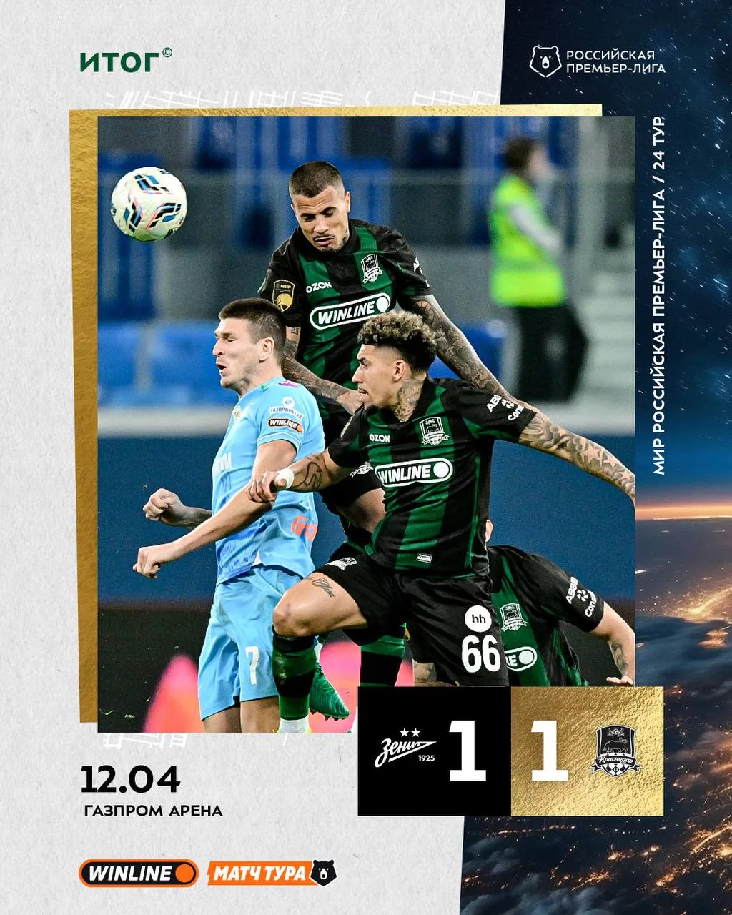 «Краснодар» сыграл вничью с «Зенитом» в Санкт-Петербурге в матче 24-го тура РПЛ и сохранил за собой первое место в турнирной таблице. Игра завершилась со счетом 1:1.У «Зенита» на 27-й минуте забил Вендел.«Краснодар» на 69-й ответил мячом...