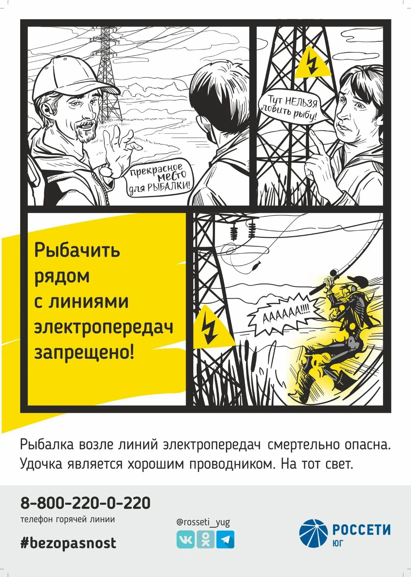 Рыбалка под ЛЭП смертельно опасна! Энергетики предприятия Ленинградские электрические сети #РоссетиЮг – #Кубаньэнерго напоминают, что ловля рыбы рядом с линиями электропередачи может привести к трагическим последствиям, и призывают рыбаков соблюдать простые правила электробезопасности: