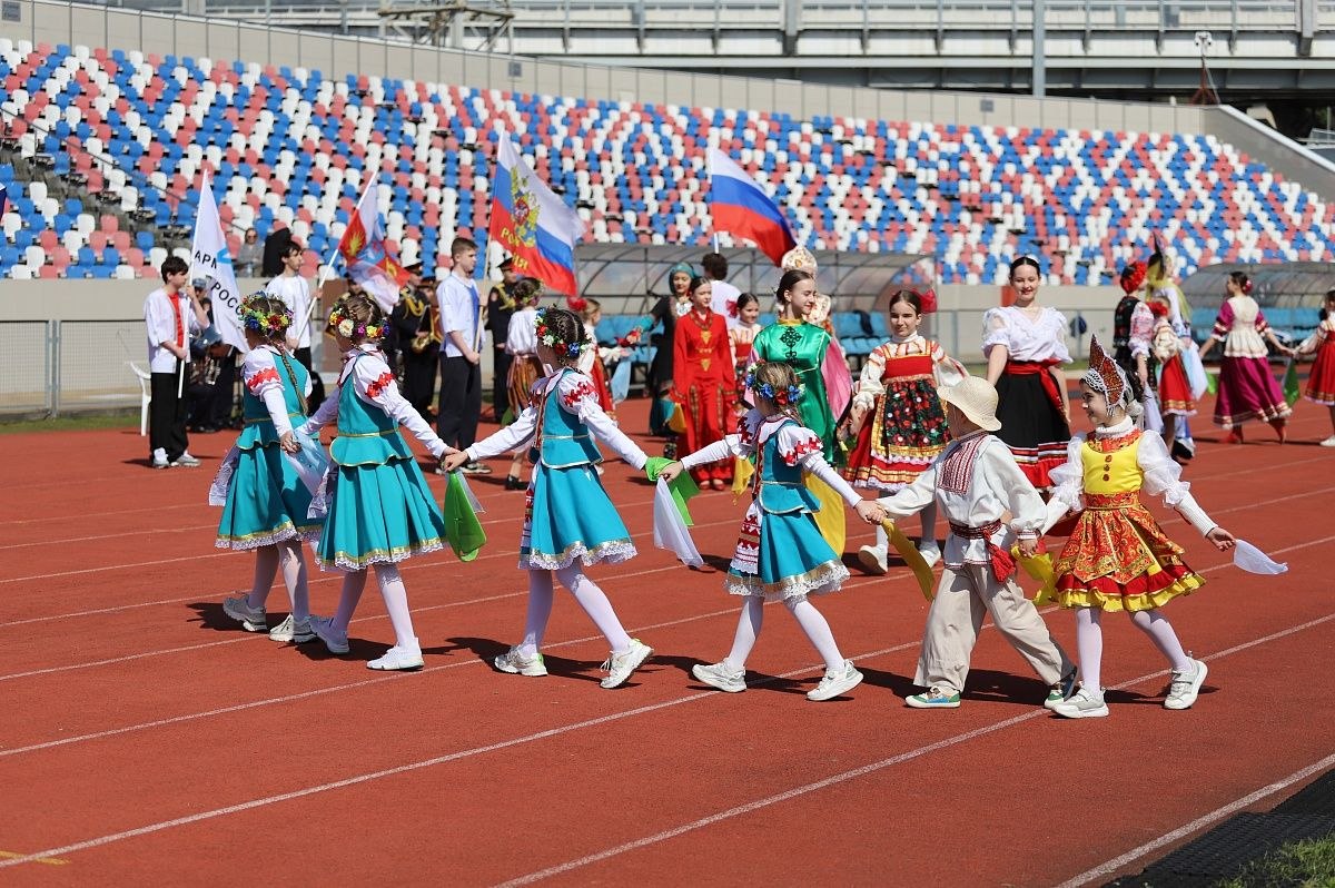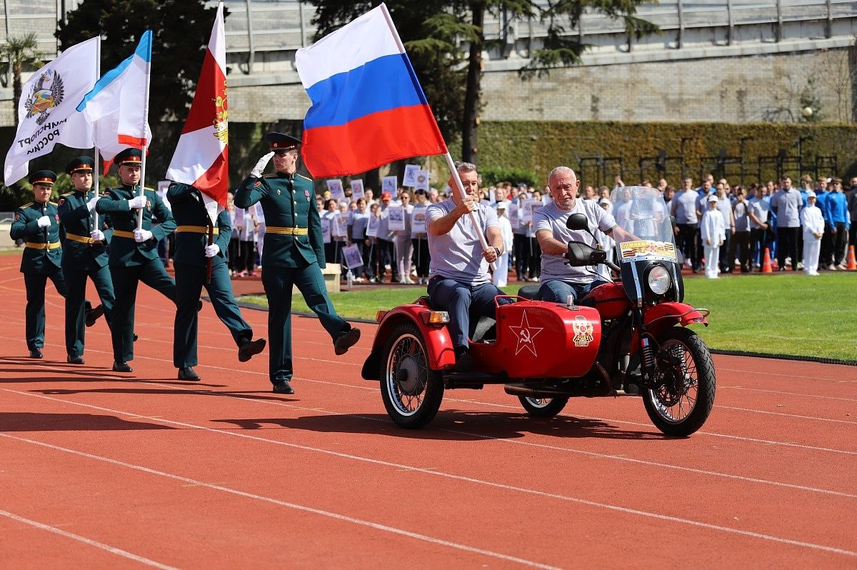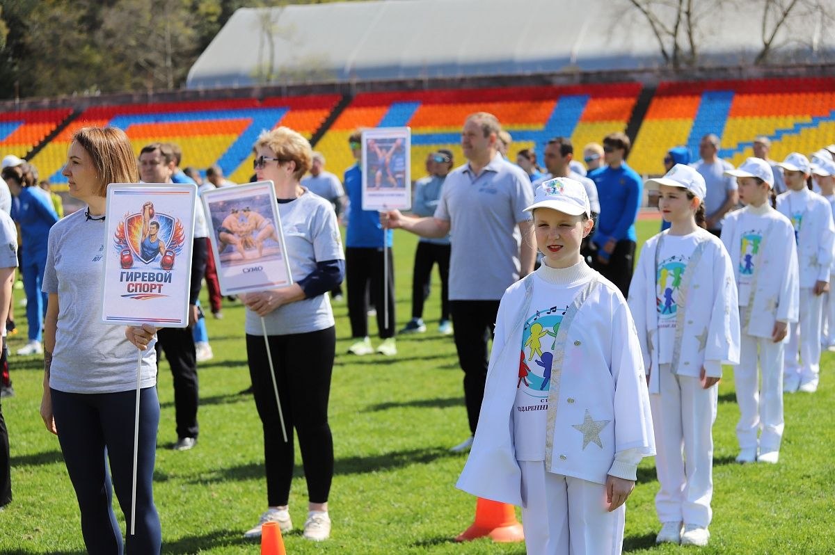После официальных поздравлений по стадиону торжественным маршем прошли сотрудники «Юг Спорта», спортсмены, находящиеся на тренировочных сборах, и воспитанники городских детско-юношеских спортивных школ. Участники несли таблички с названиями более 100 видов спорта, которые представлены на базе центра.