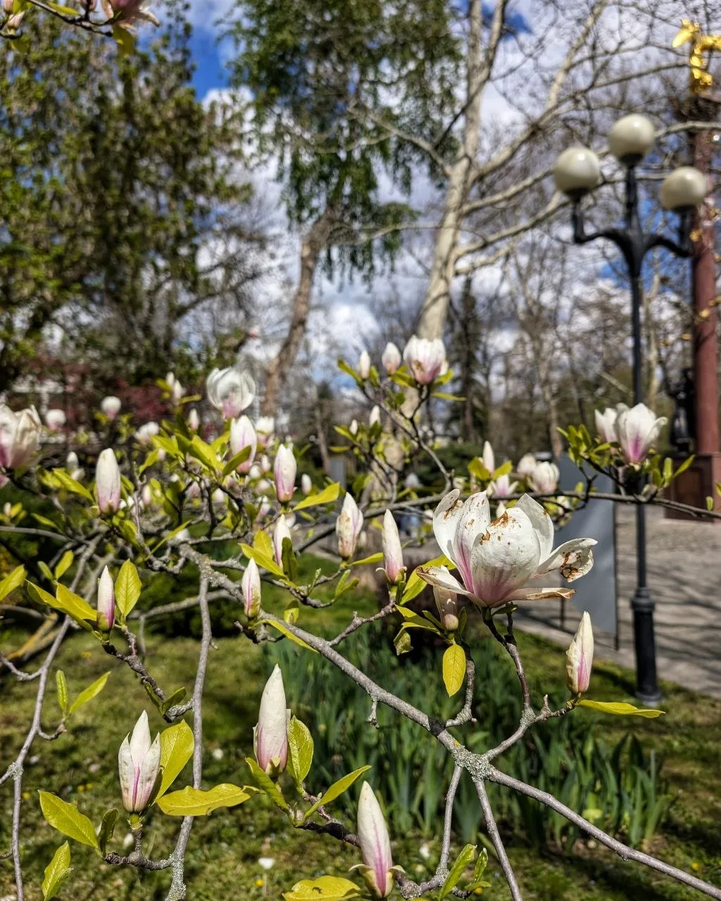 Сейчас в старейшем парке Краснодара цветут тюльпаны, одуванчики, черемуха, а также магнолия. На пруду – традиционные рыбаки, а среди высоких деревьев белеет ротонда. И вот оно - умиротворение!