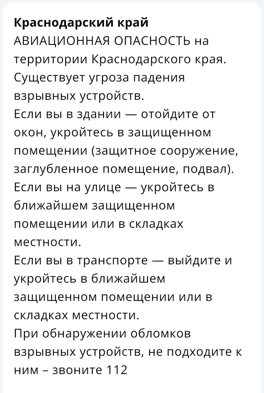 ВНИМАНИЕНа территории города Сочи ОБЪЯВЛЕНА УГРОЗА атаки беспилотных летательных аппаратов (БПЛА)Если вы находитесь дома:• Не подходите к окнам• Укройтесь в комнате, окна которой не выходят на море или в помещении без...