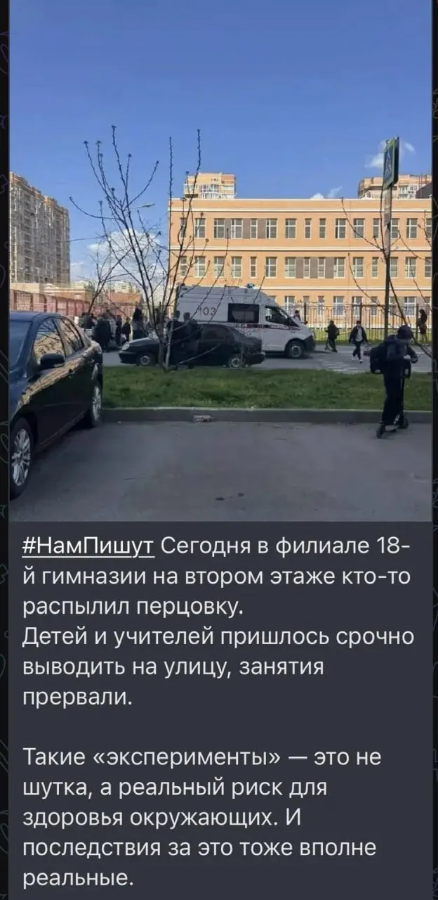 По информации департамента образования Краснодара, в филиале гимназии №18 ученик 9 класса распылил перцовый баллончик.