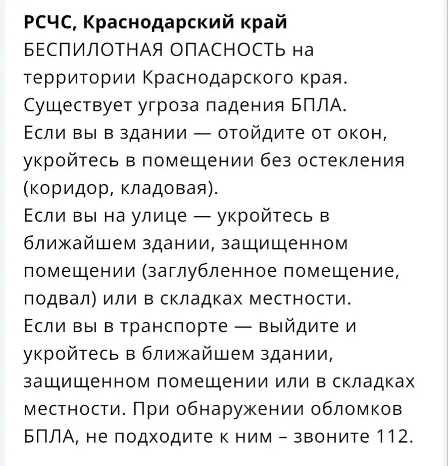 В Краснодарском крае действует сразу два предупреждения: о беспилотной угрозе и ракетной опасности.Следует позаботиться о безопасности и не подходить к окнам!Кубань...