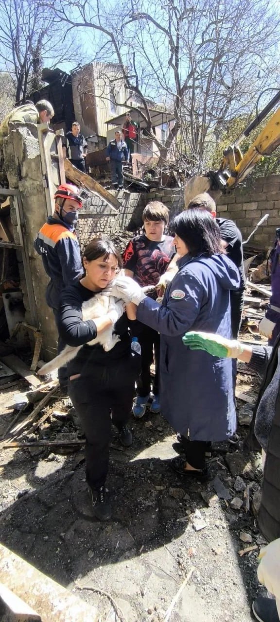 Параллельно спасатели «Кубань-СПАС» работают на месте другого разрушенного дома. Под обломками нашли живую кошку — её передали хозяйке.