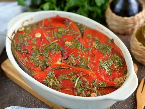 После того как овощи остынут, необходимо снять шкурки с баклажанов и перцев, а семена из перца удалить. Баклажаны помещают в дуршлаг под гнет, чтобы избавиться от излишков жидкости. Затем их нарезают ломтиками толщиной до 1 см и укладывают в форму слоями, чередуя их с запеченным перцем и поливая заправкой. Каждый слой немного подсолить и поперчить для лучшего вкуса.