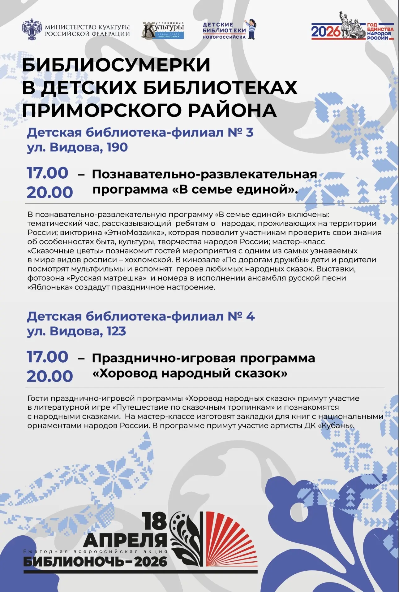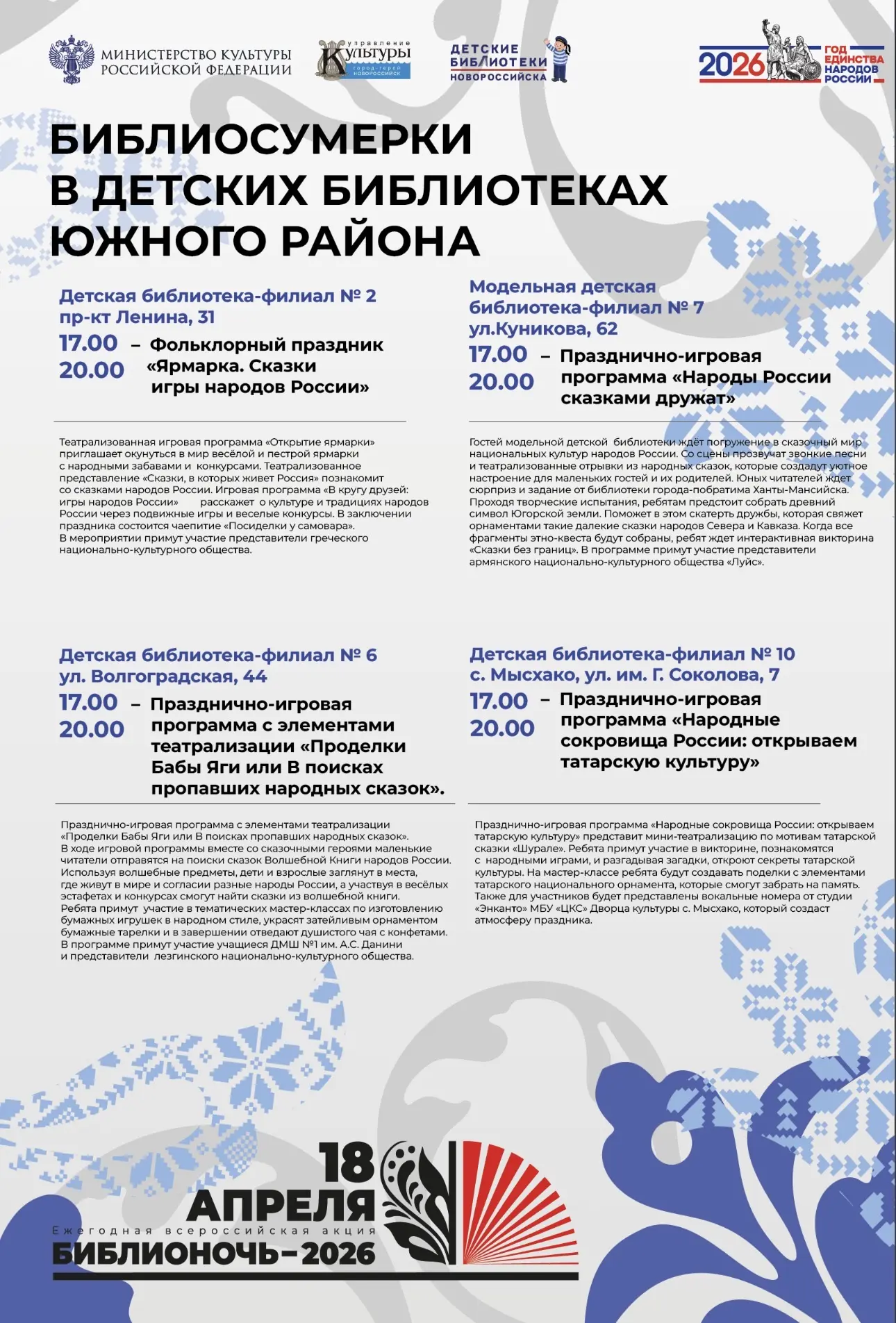 В Новороссийске с 17:00 до 20:00 для всех юных новороссийцев и их родителей будут открыты детские библиотеки города-героя в рамках проекта «Библиосумерки». В этот вечер все желающие смогут погрузиться в удивительно мудрый мир народных сказок, познакомиться с традициями народов нашей многонациональной страны, поиграть в народные игры, услышать звонкие песни и стихи о России.