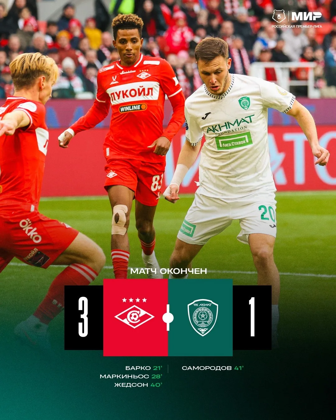 "Спартак" со счетом 3:1 обыграл "Ахмат" в матче РПЛ.
