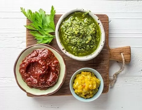 - Ароматный песто с петрушкой и вялеными томатами: Добавление кешью и вяленых томатов сделает соус насыщенным и глубоким по вкусу.