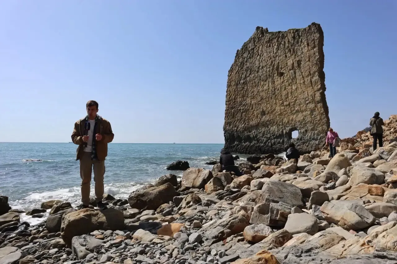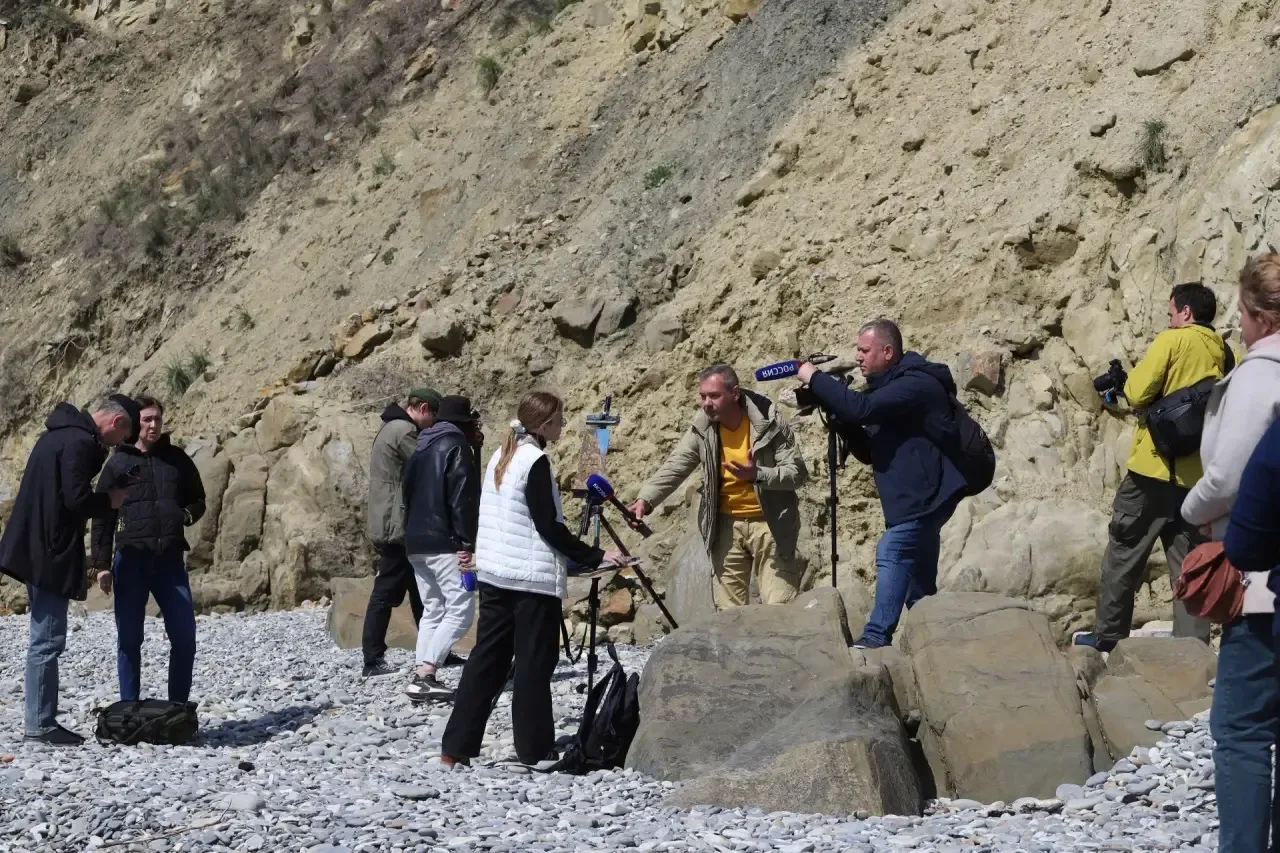 Затем участники пресс-тура отправились в село Прасковеевка - к скале Парус. Огромная прямоугольная скала толщиной несколько метров, уходящая в море - остаток мощного пласта песчаника, который формировался миллионы лет. Именно из таких пластов древние строители добывали блоки для дольменов.